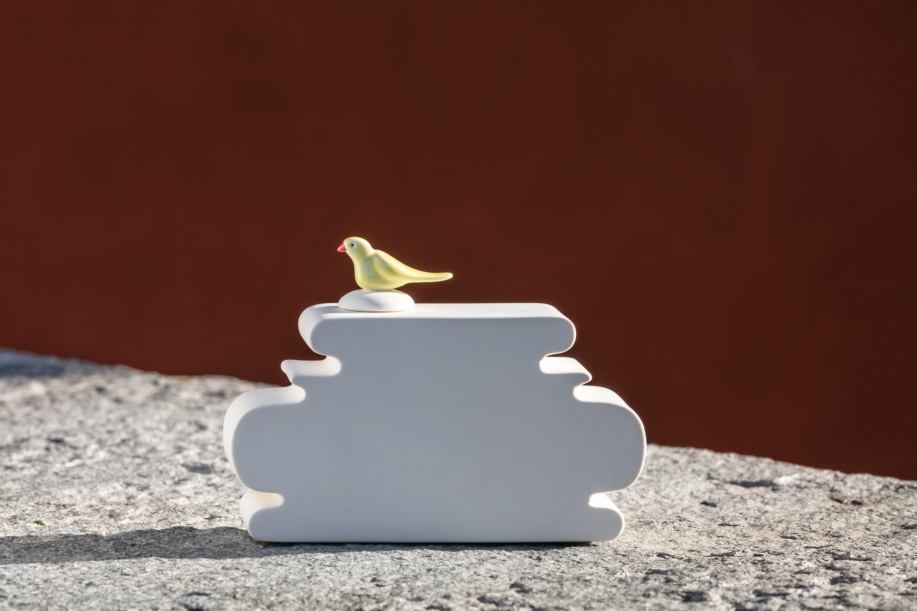 «Coltivo una piccola ossessione per le nuvole e volendo evitare scelte scontate, ho attinto dal mio repertorio di forme curvilinee pensando a Jean Arp con una strizzata d’occhio alle geometrie di Sophie Taeuber-Arp. Questa è una nuvola architettonica, fluida e al contempo concreta, un punto fisso nello spazio. Il canarino, mio tema ricorrente, assume il significato simbolico di sentinella, ora parte della comunità di uccelli che trovano rifugio nell’oasi urbana al Ronco dei Fiori, dimora di Jean Arp e Marguerite Arp-Hagenbach a Locarno-Solduno. Questo piccolo vaso coperto, è pensato per un singolo fiore, ma potrebbero evocativamente essere anche tre.»